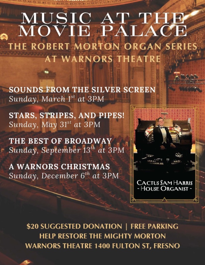 Each concert begins at 3:00 PM and celebrates the timeless sound of the theatre organ in one of Fresno’s most treasured venues.